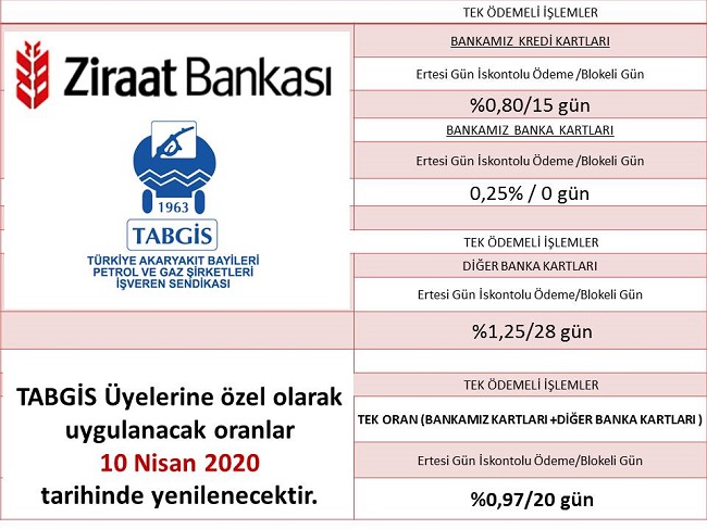 TABGİS Üyelerine uygulanacak oranlar, 10 Mart 2020 tarihi itibariyle geçerli olacak...