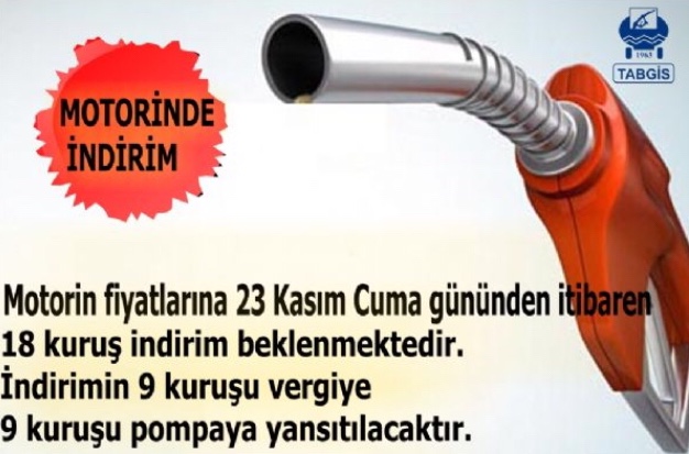 TABGİS açıkladı. Motorine Cuma itibariyle litre de 18 kuruş ucuzlama oldu.