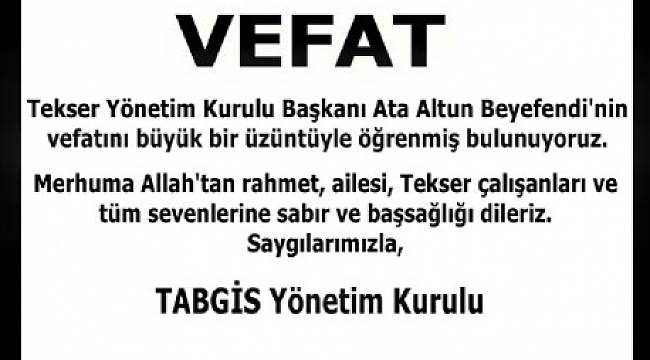 Akaryakıt sektörü temsilci kuruluşlarından TABGİS, enerji sektöründe faaliyet gösteren Tekser Akaryakıt AŞ Yönetim Kurulu Başkan’ı Ata Altun’un vefatı nedeniyle bir taziye mesajı yayınladı. Taziye mesajını görmek için haberin sonundaki foto üstüne tıklayınız.
