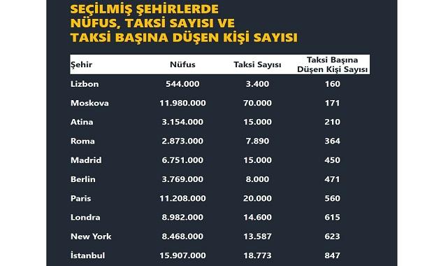- New York, Londra, Paris, Moskova, Berlin'in içinde olduğu 10 önemli şehre baktık. Taksi başına düşen kişi sayısı açısından en kötü durumda olan şehir İstanbul.''