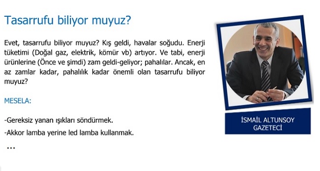 Evet, Tasarrufu biliyor muyuz? Kış geldi, havalar soğudu. Enerji tüketimi (Doğal gaz, elektrik, kömür vb) artıyor. Ve tabi, enerji ürünlerine (Önce ve şimdi) zam geldi-geliyor; pahalılar. Ancak, en az zamlar kadar, pahalılık kadar önemli olan tasarrufu biliyor muyuz?