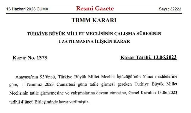 Türkiye Büyük Millet Meclisi (TBMM), 1 Temmuz 2023 tarihinde tatile girmeyecek. TBMM, çalışmasına 1 Temmuz 2023 tarihi itibariyle çalışmalarına devam edecek. TBMM'nin 1 Temmuz 2023 tarihi itibariyle çalışmasına devam etmesi konulu kararı, bugünkü Resmi Gazete'de yayınlandı (16 Haziran 2023 tarihli Resmi Gazete).
