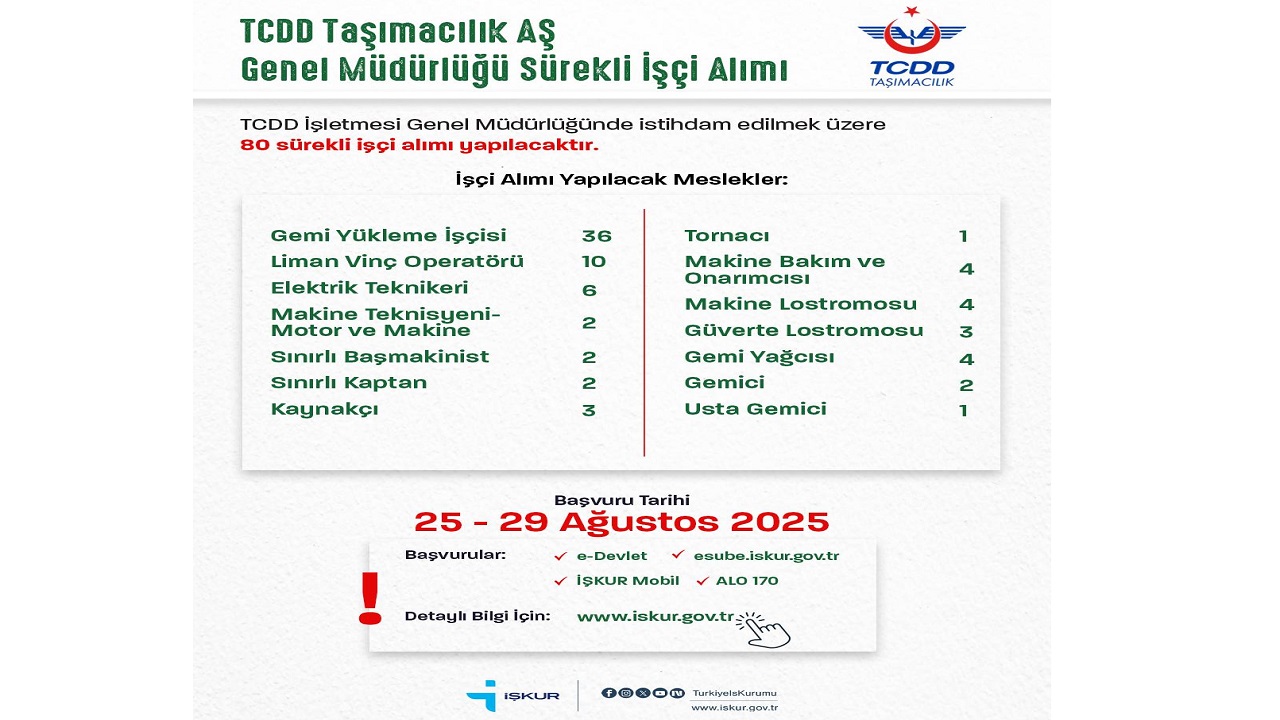 İŞKUR (Türkiye İş Kurumu), bilgi paylaşımı yaptı: ''TCDD (Türkiye Cumhuriyeti Devlet Demiryolları ) İşletmesi Genel Müdürlüğünün 80 Kişilik İşçi Alım İlanı Başvuruları Başladı.'' TCDD işçi alımı için başvurular 29 Ağustos 2025 Cuma günü sona erecek.