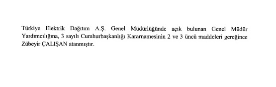 Türkiye Elektrik Dağıtım AŞ (TEDAŞ)'a atama yapıldı. Atamayla ilgili Cumhurbaşkanı kararı Resmi Gazetede yayınlandı.