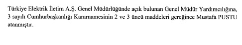 Türkiye Elektrik İletim AŞ (TEİAŞ) Genel Müdür Yardımcılığına atama yapışdı. Atama Kararı Resmi Gazetede yayınlandı. Karara göre TEİAŞ Genel Müdür Yardımcılığı'ma Mustafa Pustu atand.