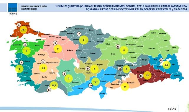 TEİAŞ (Türkiye Elektrik İletim AŞ) duyurusu şöyle: ''Kapasite tahsisleriyle ilgili olarak T.C. Enerji Piyasası Düzenleme Kurulu tarafından 08.02.2024 tarihli ve 12415 sayılı Karar alınmıştır. Bu kapsamda “İletim Seviyesi Kalan Kapasite Tablosu” ve “Elektrik Piyasasında Lisanssız Elektrik Üretim Yönetmeliği İletim Sistemine Bağlantı Başvuruları Teknik Değerlendirme Raporu” aşağıda yer almaktadır. Bilgilerinize sunulur.''