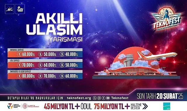 Akıllı Ulaşım Yarışması, seyahat sürelerini azaltmayı, trafik güvenliğini artırmayı, mobiliteyi geliştirmeyi ve enerji verimliliği sağlamayı hedefliyor. Kara, hava ve deniz ulaşımı olmak üzere üç ana başlıkta gerçekleştirilen yarışmada, gençlerden her kategoride geleceğin ihtiyaçlarına yönelik yenilikçi projeler geliştirmeleri bekleniyor. Kara ulaşımında “Akıllı Trafik Yönetimi ve Optimizasyonu”, “Otonom Araçlar ve Akıllı Araç Teknolojileri”, “Akıllı Park Sistemleri”, “Yol Güvenliği ve Acil Durum Yönetimi”, “Elektrikli Araçlar ve Şarj İstasyonları Ağı” ve “Yolcu Ulaşım ve Hizmet Sistemleri” gibi konularda çözüm aranacak. Öte yandan “Akıllı Havaalanı Yönetimi”, “Dronlar ve Hava Taşımacılığı”, “Uçuş Trafiği Yönetimi ve Optimizasyonu” ve “Akıllı Uçak Sistemleri” konularında Hava ulaşımının verimli kullanımı için projeler geliştirilecek. Deniz ulaşımında ise “Otonom Deniz Taşımacılığı ve Akıllı Gemiler”, “Deniz Trafiği Yönetimi”, “Sürdürülebilir Deniz Taşımacılığı”, “Limanda Akıllı Yükleme-Boşaltma Sistemleri” ve “Deniz Kirliliği İzleme ve Erken Uyarı Sistemleri” gibi başlıklar altında geliştirilecek projeler, ulaşım sistemlerini daha güvenli, sürdürülebilir ve teknolojik açıdan ileri bir seviyeye taşıyarak toplumun gelecekteki ihtiyaçlarına cevap vermeyi amaçlıyor.