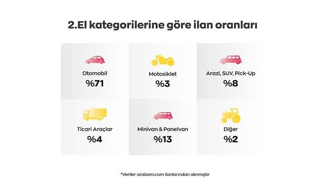 arabam.com’da temmuz ayında ikinci el araç ilanlarının %71’ini otomobiller oluşturdu. Otomobilleri sırasıyla hafif ticari araçlar, arazi araçları, ticari araçlar ve motosikletler izledi. Traktör ve tarım iş makineleri gibi ilanlar ise %2’lik kısmı oluşturdu.
