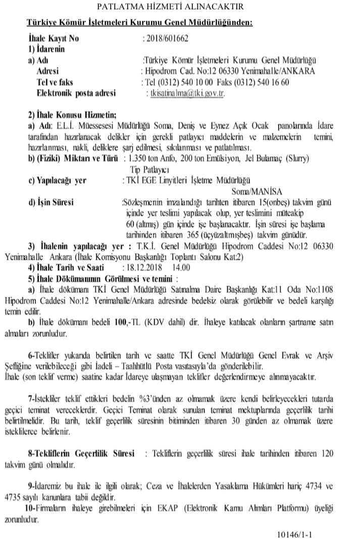 Türkiye Kömür İşletmeleri (TKİ) Kurumu Genel Müdürlüğü, patlatma hizmeti almak için ihale açtı. İhale duyurusu aşağıda okunabilir.
