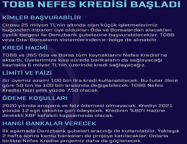 TOBB öncülüğünde geliştirilen ve işletmelere cansuyu olacak 'Nefes Kredisi' ayrıntıları netleşti. TOBB Başkanı Rıfat Hisarcıklıoğlu, Nefes Kredisi'nin ayrıntılarını duyurdu. İşte Nefes Kredisi...