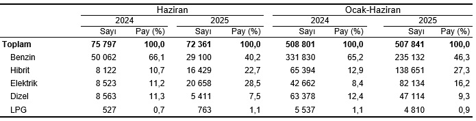 Trafiğe kaydı yapılan otomobillerin yakıt cinslerine göre dağılımı, Haziran 2025