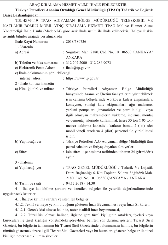 Türkiye Petrolleri Anonim Ortaklığı (TPAO), araç kiralama ihalesi açtı. İhale duyurusu Resmi Gazetede yayınlandı. İşte o duyuru: