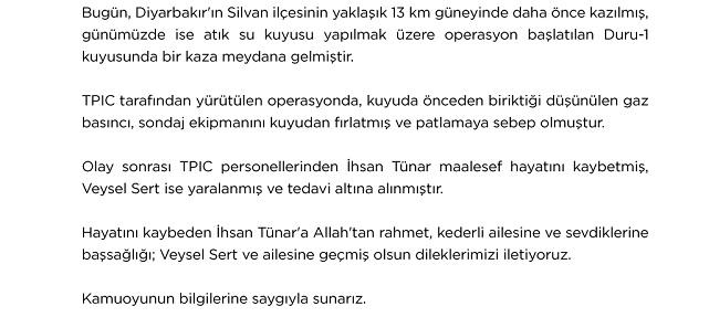 Türkiye Petrolleri (TPAO), Diyarbakır'da Durusu 1 kuyusunda ''gaz basıncı ve sonrasında yaşanan patlama'' ile ilgili bir açıklama yaptı. Patlamada TPIC personeli İhsan Tünar vefat etti. TPAO açıklamasını aşağıda okuyabilirsiniz.