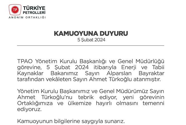 Türkiye Petrolleri Anonim Ortaklığı (TPAO) Genel Müdürlüğü'ne, vekaleten Ahmet Türkoğlu atandı.