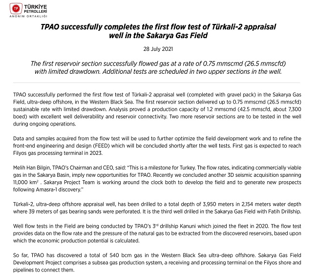 TPAO successfully completes the first flow test of Türkali-2 appraisal well in the Sakarya Gas Field