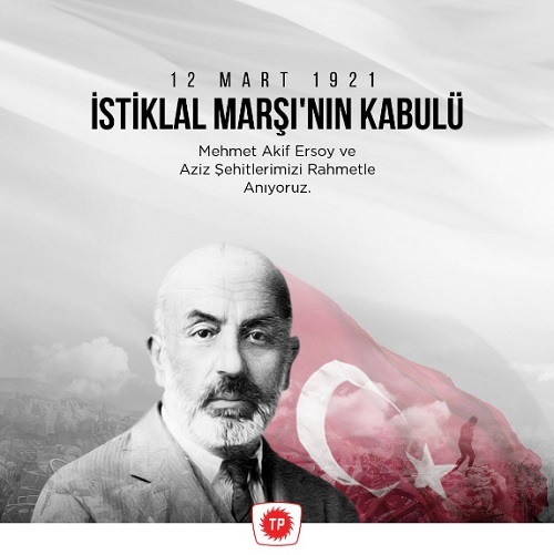 TPAO (Türkiye Petrolleri Anonim Ortaklığı), İstiklal Marşımızın kabulünün 98. yıl dönümü nedeniyle sosyal medya üzerinden bir mesaj yayınladı. TPAO'nun mesajı şöyle: İstiklal Marşımızın kabulünün 98.yıl dönümünde Vatan Şairi Mehmet Akif Ersoy’u ve aziz şehitlerimizi rahmetle anıyoruz.