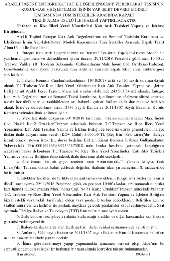 Trabzon ve Rize Katı atık tesisi Araklı’da yapılacak: İhale açıldı. İhale duyurusu Resmi Gazetede yayınlandı.