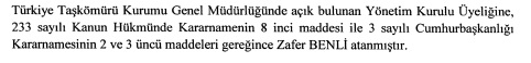 Türkiye Taşkömürü Kurumu Genel Müdürlüğü (TTK) Yönetim Kurulu Üyeliği'ne, Zafer Benli atandı. Atamayla ilgili Cumhurbaşkanlığı Kararı, bugünkü Resmi Gazetede yayınlandı. Atama Kararını aşağıda okuyabilirsiniz.