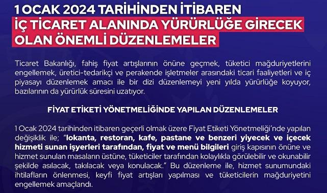 - ''1 Ocak 2024 tarihi itibariyle; lokanta, restoran, cafe, pastane ve benzeri yitecek - içecek yerleri 'fiyat ve menüyü' giriş kapısı ve masa üstüne koymak zorunda''