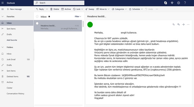 Kubovic, “Kurbanın e-postayı açtıktan sonraki 48 saat içinde ödeme yapması isteniyor. Aksi takdirde siber suçlu, söz konusu videoyu ele geçirdiği cihazda iletişim bilgileri yer alan tüm kişilere görüntüleri göndermekle tehdit ediyor” dedi.
