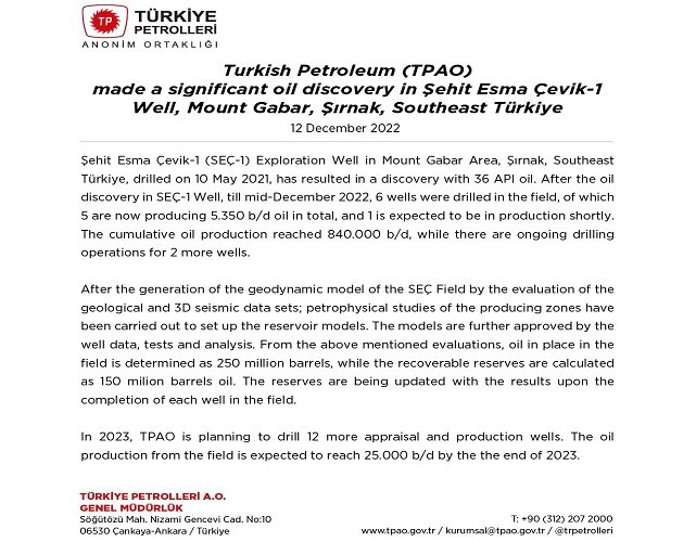 'Şehit Esma Çevik-1 (SEÇ-1) Exploration Well in Mount Gabar Area, Şırnak, Southeast Türkiye, drilled on 10 May 2021, has resulted in a discovery with 36 API oil.