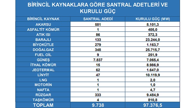 Bu rakamlar Mart 2021 sonu itibariyle; santral adeti 9.665 ve kurulu güçte 97.069 MW idi. Nisan 2021 sonu itibariyle Türkiye'nin hem elektrik santral adeti ve hem de kurulu gücü artış gösterdi.