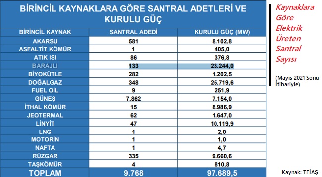Türkiye Elektrik İletim AŞ (TEİAŞ), Mayıs 2021 sonu itibariyle elektrik üreten santral sayılarını açıkladı. TEİAŞ verilerine göre Türkiye'de elektrik üreten toplam 9.768 adet elektrik santrali var.
