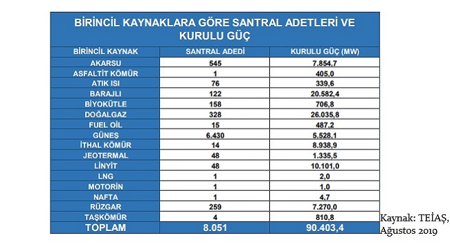 Veriler - bilgi için kaynak, Türkiye Elektrik İletim AŞ (TEİAŞ, Ağustos 2019).