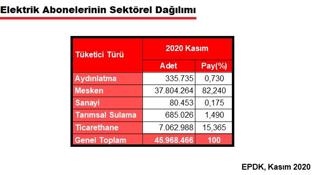 Türkiye'de toplam 45.968.466 adet elektrik abonesi var. Elektrik abonesi sıralamasında konutlar ilk sırada, ticarethaneler 2. sırada ve tarımsal sulama 3. sırada yer alıyor.