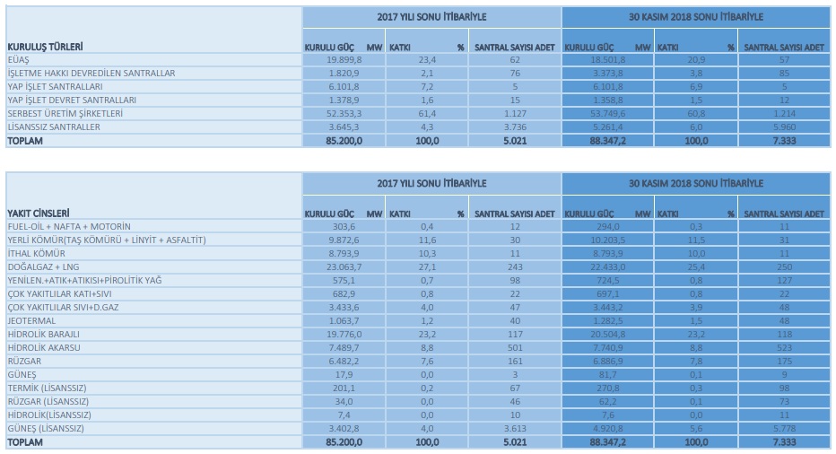 TÜRKİYE ELEKTRİK ENERJİSİ KURULUŞ VE KAYNAKLARA GÖRE KURULU GÜCÜ