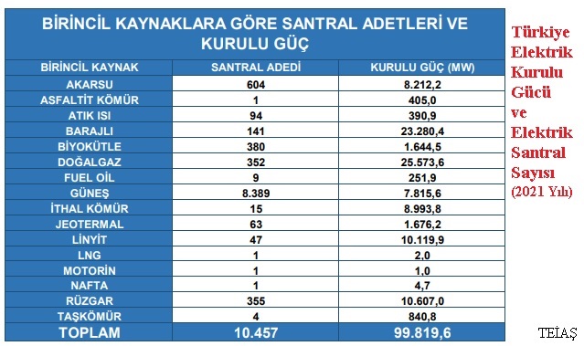 Türkiye Elektrik İletim AŞ (TEİAŞ) Yük Tevzi Dairesi Başkanlığı (YTBS), 2021 yılının son Kurulu Güç Raporu'nu yayınladı. Türkiye'nin elektrik santral sayısı ve kurul güç verileri için, haberin sonundaki foto üstüne tıklayınız.