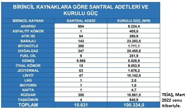 TEİAŞ (Türkiye Elektrik İletim AŞ) verilerine göre Türkiye'nin elektrik kurulu gücü, 100.334,0 MW (Megawat) oldu (Mart 2022 sonu itibariyle). Aynı dönemde elektrik üreten toplam santral sayısı ise 10.631 oldu.Toplam elektrik enerjisi kurulu gücünde ise ilk sırada HES'ler (Akarsu, barajlı) yer alırken ikinci sırada doğal gaz santralleri yer aldı.