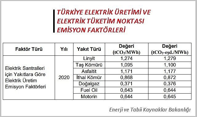 Bakanlığımızca hesaplanan Türkiye Elektrik Üretimi ve Elektrik Tüketim Noktası Emisyon Faktörleri, birim net elektrik üretimi ve birim elektrik tüketimi başına salınan sera gazı emisyonlarının miktarlarını temsil etmektedir. Söz konusu faktörler elektrik özelinde; karbon ayak izi hesaplamaları ve enerji verimliliğine yönelik iyileştirmelerle sağlanan sera gazı azaltım miktarlarının hesaplanması gibi çeşitli alanlarda kullanılabilecektir. Hesaplamalara göre, Türkiye genelinde 1 MWh (birim) net elektrik üretimi başına ortalama 0,440 ton CO2-eşd. sera gazı emisyonu salınmaktadır. Türkiye geneli elektrik üretiminin yanı sıra elektrik santralleri için yakıtlara göre hesaplanan elektrik üretim emisyon faktörleri kullanılan yakıt türüne göre farklılık göstermektedir. Örneğin, yakıt türü doğalgaz olan bir elektrik üretim santralinde birim net elektrik üretimi başına 0,376 ton CO2-eşd. sera gazı emisyonu salınmaktadır. Son olarak, elektrik tüketim noktası emisyon faktörleri bağlantı noktasına göre değişiklik göstermekle birlikte iletim hattından bağlı tüketim noktası için birim elektrik tüketimi başına 0,447 ton CO2-eşd., dağıtım hattından bağlı tüketim noktası için birim elektrik tüketimi başına 0,484 ton CO2-eşd. sera gazı emisyonu salınmaktadır. '