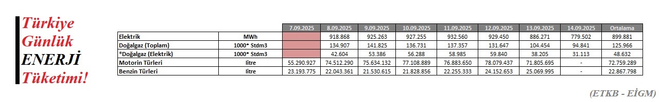 7-14 Eylül 2025 tarihleri arası (37. hafta) Türkiye günlük benzin tüketimi 22,8 milyon metreküp olu. Aynı dönem doğal gaz tüketimi ise 125,9 milyon metreküp (m3) oldu. Elektrik tketimi ise 7-14 eylül tarihlerinde ortalama 899,8 milyon kilowatsaat (kwh) oldu.