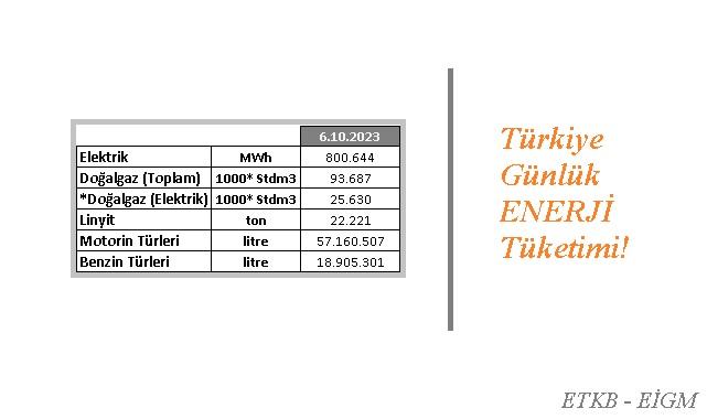 - Türkiye günlük enerji tüketimleri (elektrik, akaryakıt, doğal gaz, linyit vb) ayrıntıları için aşağıdaki tabloya bakınız).