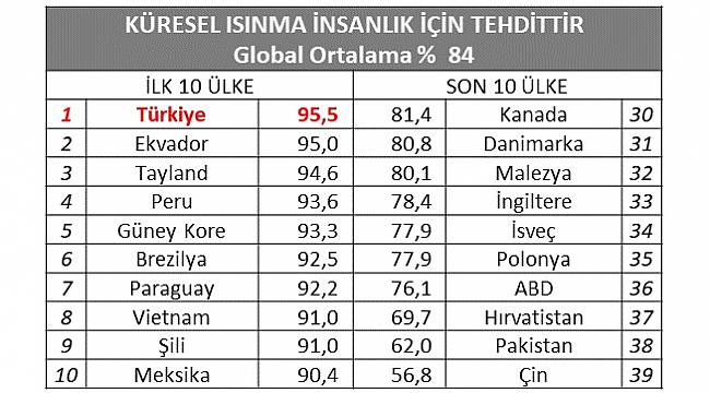 Ülkelerin küresel ısınma önermelerini kabul etme oranları ile ilk 10 ülke ve son 10 ülke sıralaması yapıldığında; Türkiye’nin küresel ısınma farkındalığı en yüksek 10 ülke içinde 5. sırada yer aldığı görülüyor. Çarpıcı olansa, küresel ısınma farkındalığında ABD, İngiltere ve Kanada gibi ülkelerin son 10 içinde yer alması. Türkiye’de farkındalık oranı yüzde 94 iken, bu oran ABD’de yüzde 72.