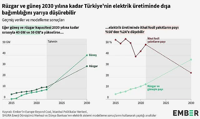 - Türkiye 2030 yılına kadar rüzgar ve güneş enerjisinde yapacağı atılımla elektrik üretimindeki dışa bağımlılığını yarıya indirebilir. 2021 yılında elektriğinin %50’sini ithal kömür ve doğalgaz ile üreten Türkiye, sekiz yıl içinde bu oranı %25’in altına düşürebilir. Bunu gerçekleştirebilmek için rüzgar ve güneşin elektrik üretimindeki payının tüm kaynaklar arasında en az üçte bir oranına yükselmesi gerekiyor. 2021 yılı itibariyle rüzgar ve güneşin elektrik üretimindeki payı %13,6 seviyesindeydi.