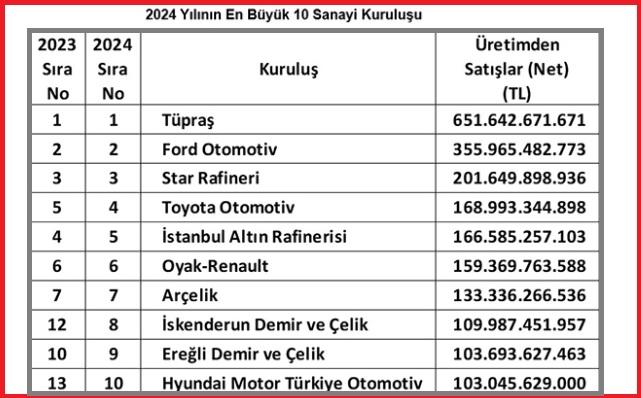 - Türkiye'nin en büyük ilk 10 sanayi kurluşu (2024 sıralaması)
