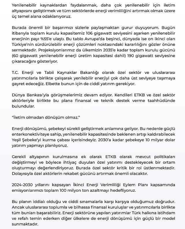 - ''Dubai’de devam eden COP 28 kapsamında Dünya Bankası tarafından Türkiye’ye özel düzenlenen enerji dönüşümü paneline video mesaj ile katılarak Türkiye'nin bu alandaki dönüşüm planlarını anlattım''