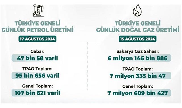 - Türkiye günlük petrol üretimi: 107 bin 121 varil (17 Ağustos 2024, günlük üretim).