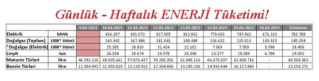 Türkiye'nin günlük ve haftalık enerji tüketimi (benzin, motorin, elektrik, doğal gaz ve kömür ) verileri için aşağıdaki tabloya bakınız...
