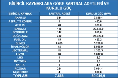 Türkiye'nin birincil kaynaklara göre toplam 7.668 adet elektrik santrali var (Şubat 2019 itibariyle). Bu santrallerin toplam kurulu gücü ise 89.046,9 megawat (MW).