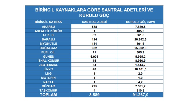 Rapora göre Türkiye'nin Aralık 2019 sonu itibariyle toplam 8 bin 589 adet elektrik santrali var. Bu santrallerin toplam kurulu gücü ise 91 bin 267 megawat (MW).