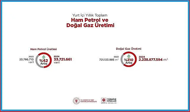 Türkiye geçen yıl (2024), toplam 33,7 milyn varil petrol ve 2,2 milyar metreküp doğal gaz üretti. Türkiye petrol üretimi geçen yıl (2024), bir önceki yola göre (202) yüzde 2 ve doğal gaz üretimi de aynı dönemde yüzde 210 artış sağladı. Petrol ve doğal gaz üretimi ayrıntıları için aşağıdaki tabloya bakınız.
