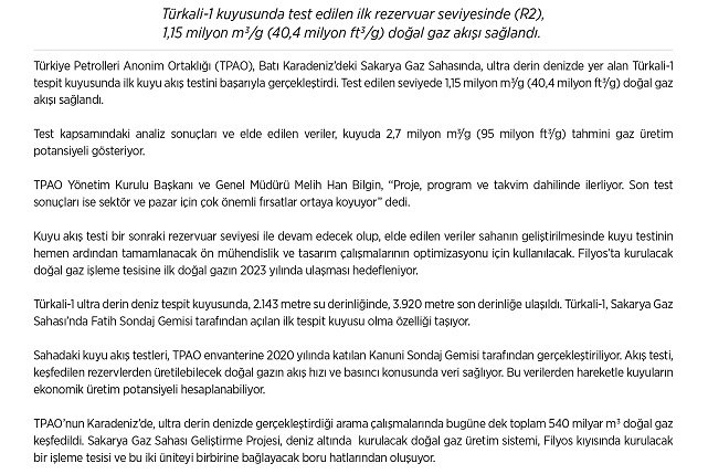 'TPAO - Sakarya Gaz Sahası’ndaki Türkali-1 tespit kuyusunda, ilk rezervuar seviyesinde (R2) gerçekleştirdiği kuyu akış testini başarıyla tamamladı' açıklamasının tam metni...