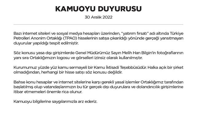 Türkiye Petrolleri AO'nun (TPAO) duyurusu şöyle: Bazı internet siteleri ve sosyal medya hesapları üzerinden, "yatırım fırsatı" adı altında Türkiye Petrolleri Anonim Ortaklığı (TPAO) hisselerinin satışa çıkarıldığı yönünde gerçeği yansıtmayan duyurular yapıldığı tespit edilmiştir.