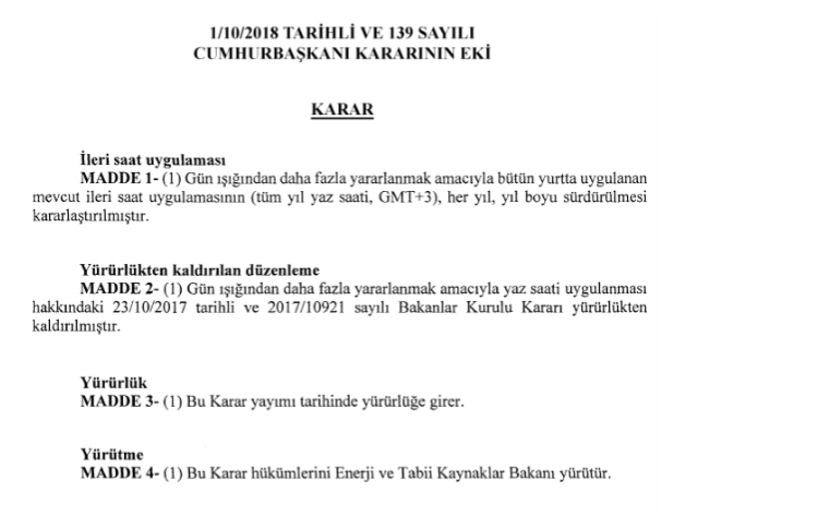 Türkiye sürekli ilerisaat uygulamasına geçti. Enerji tasarrufu amacıyla saatler, kışın bir saat geri yazın ileri alınıyordu. Uzun zamandır daha fazla enerji tasarrufu için sürekli ileri saat uygulaması tartışılıyordu.