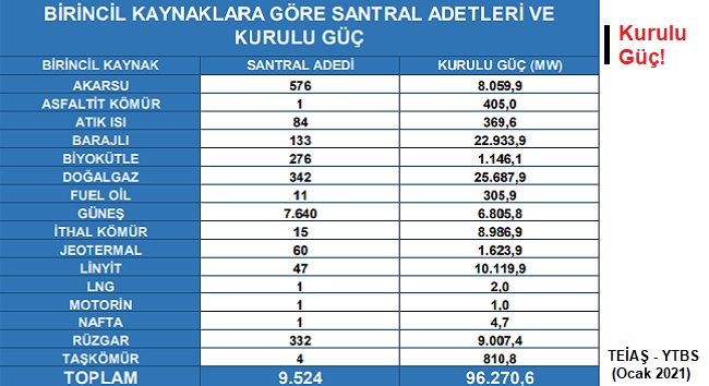 Türkiye'nin elektrikte toplam kurulu gücü Ocak 2021 sonu itibariyle 96 bin 270 MW (Megawat) oldu. Bu rakam Aralık 2021 sonu itibariyle 95 bin 890 MW idi. Türkiye'nin toplam elektrik üreten santral sayısı, kurulu güç ve kaynaklara göre üretim verileri için haberin sonundaki tabloyu inceleyiniz.