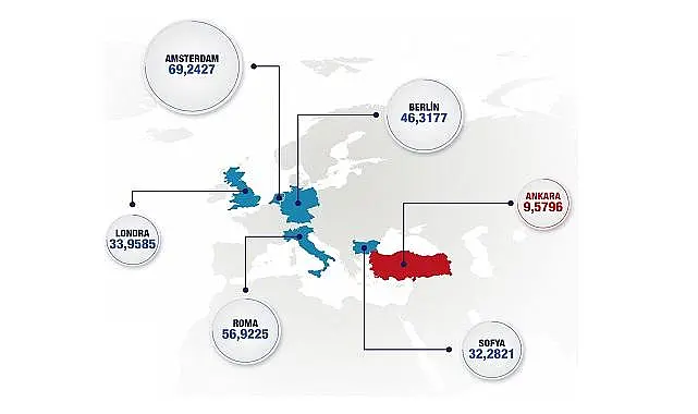 Başkentlerde doğal gaz fiyatı: Amsterdam 69 lira 2427 kuruş, Berlin 46 lira 3177 kuruş, Londra 33 lira 9585 kuruş, Roma 56 lira 9225 kuruş, Sofya 41 lira 2821 kuruş ve Ankara 9 lira 5692 kuruş (Aralık 2024 fiyatlarıyla, Konutlar).