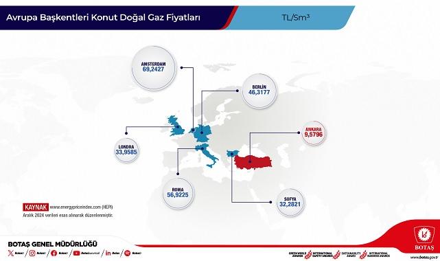 Başkentlerde doğal gaz fiyatı: Amsterdam 69 lira 2427 kuruş, Berlin 46 lira 3177 kuruş, Londra 33 lira 9585 kuruş, Roma 56 lira 9225 kuruş, Sofya 41 lira 2821 kuruş ve Ankara 9 lira 5692 kuruş (Aralık 2024 fiyatlarıyla, Konutlar).